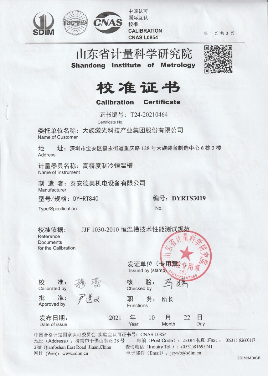 大族激光科技產(chǎn)業(yè)集團股份有限公司-高精度制冷恒溫油槽校準證書 2021-11-9 本文被閱讀 15109 次