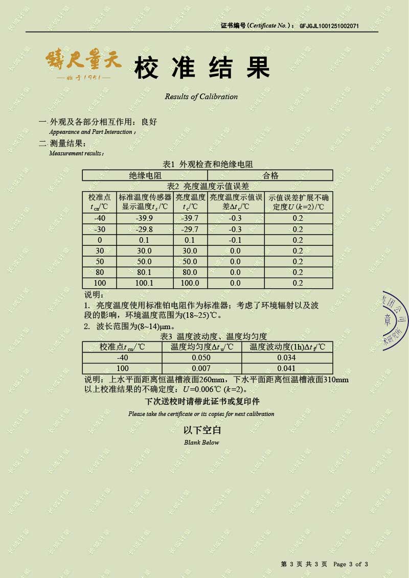 低溫液槽式黑體爐(-40-100℃)校準證書