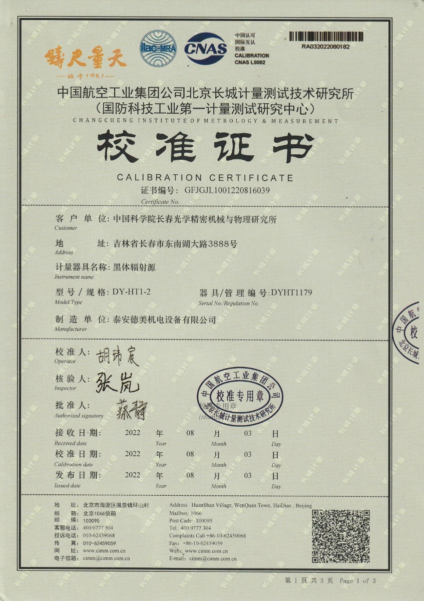 | 上一條:中國科學(xué)院長春光學(xué)精密機(jī)械與物理研究所-黑體爐DY-HT1-1 | 下一條:便攜式溫濕度檢定箱(-10-60℃)校準(zhǔn)證書 |
