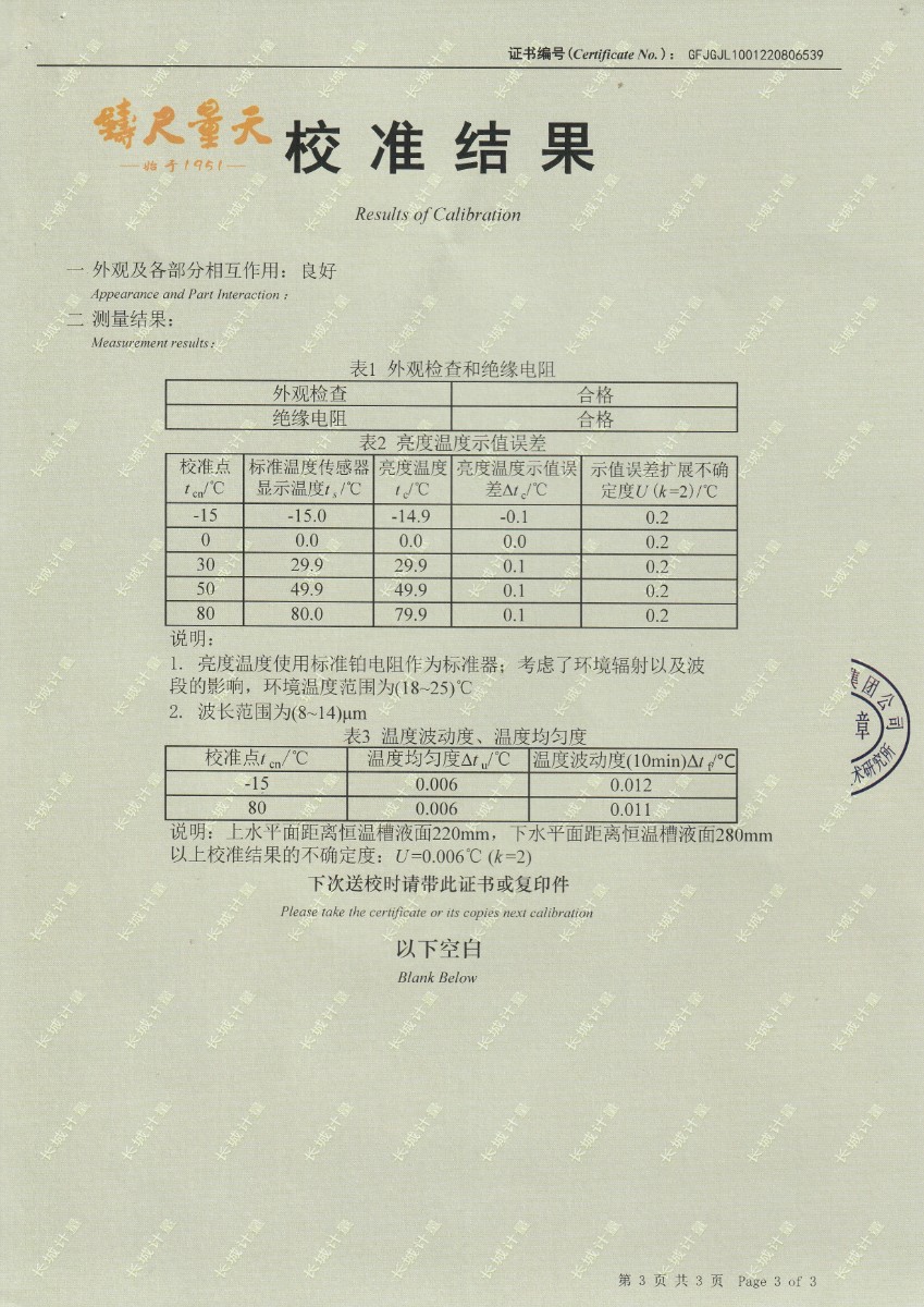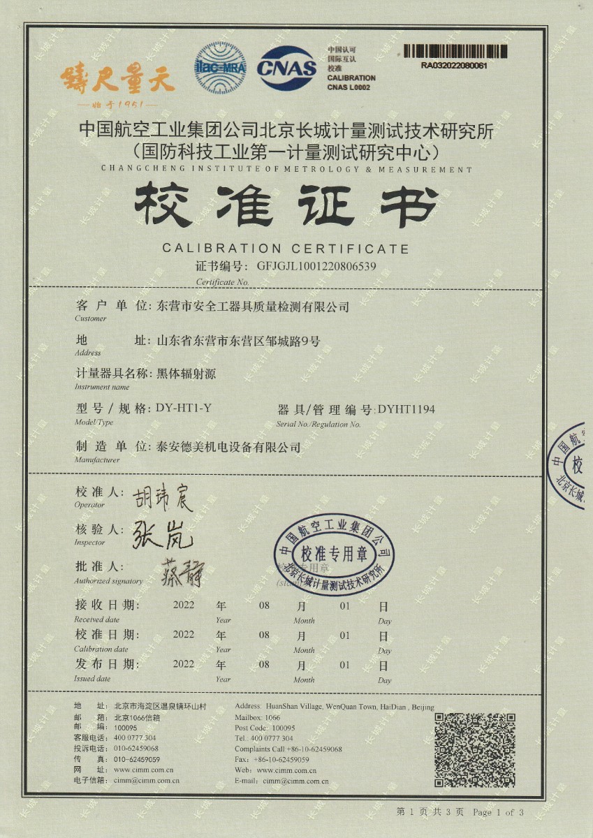 | 上一條:東營(yíng)市安全工器具質(zhì)量檢測(cè)有限公司-黑體輻射源DY-HT2 | 下一條:便攜式干體爐(-30-150℃)校準(zhǔn)證書 |